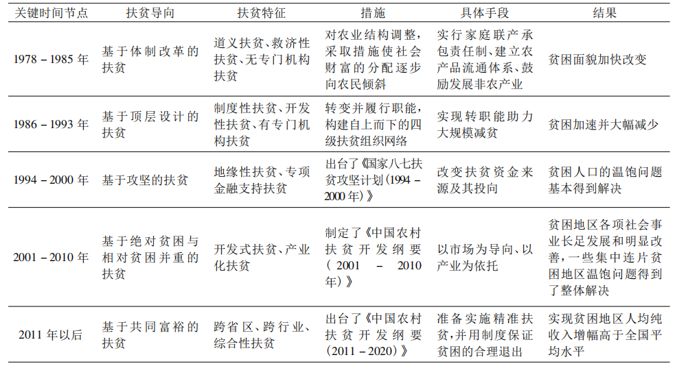 具体展开来看(如表1所示),清晰的显示了每个不同扶贫阶段的扶贫导向、扶贫特征、措施、具体手段以及扶贫成就。