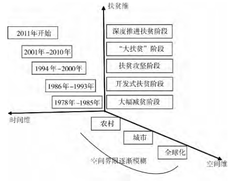 从现实来看,纵观历史,我国扶贫呈现出五个明显的阶段:一是体制改革推动的道义性大幅减贫阶段;二是基于顶层设计的组织网络式的大规模开发式扶贫阶段;三是有明确目标、明确对象、明确措施和明确期限的扶贫攻坚阶段;四是城乡统筹发展、解决绝对贫困与解决相对贫困并重的“大扶贫”阶段;五是根据全面建设小康社会的任务深度推进扶贫阶段。通过图1,可从时间、空间和贫困三个维度进一步掌握我国扶贫发展的脉络和特点。