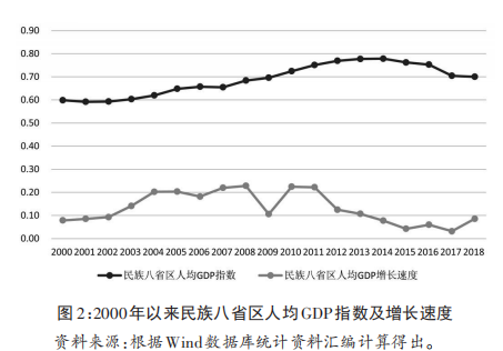 少数民族地区经济快速增长,各民族人民的生活发生了翻天覆地的变化。我们可以通过分析民族八省区人均GDP对比指数及增长速度来衡量人民生活水平(如图2所示)。2018 年民族八省区人均GDP为45262元,是2000年的9.5倍,1952年的526倍;民族八省区人均GDP指数自2000年以来,呈现不断上升的趋势,从2000年的0.60增长到2018年的0.70,这表明民族八省区人均GDP 与全国人均GDP的差距在不断缩小,区域经济协调发展的政策效应明显。自 2000年以来,民族八省区保持了年均13%的人均GDP增速,人民的生活水平得到了快速提高,成功加入了全国经济发展的快车道。