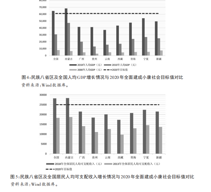 截至2018年,全国人均GDP为64644元,城乡居民人均收入为2822元,均已提前完成了全面建成小康社会的目标。但是正如习近平总书记反复强调的,“小康路上一个都不能少”,“全面建成小康社会一个民族、一个家庭、一个人都不能少”。56个民族都要建成小康社会,是少数民族和民族地区同步小康的第一要义。通过对比分析可以看出,民族八省区的人均GDP和城乡居民人均收入尚未达到 2020 年全面建成小康社会的目标值,这成为全面建成小康社会的关键所在。不过,从2000年以来民族八省区的人均GDP和全体居民人均可支配收入来看,民族八省区在全面建成小康社会的道路上进步迅速,我们对民族八省区打赢脱贫攻坚战、在全国力量的支持下全面建成小康社会充满信心。