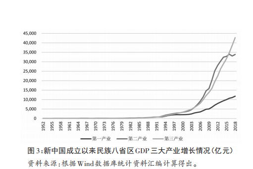 新中国成立70年来,少数民族地区在一穷二白的基础上,建立起比较完整的工业体系和国民经济体系。图3展示了民族八省区的产业发展体系从1925年到2018年的发展情况,三大产业体系经历了从无到有、从小到大的过程,第一产业生产总值增长了303倍,第二产业生产总值增长了3387倍,第三产业生产总值增长了4746倍。这样的发展成绩在全球罕见,在民族地区是绝无仅有的,创造了中国模式少数民族经济发展的奇迹。