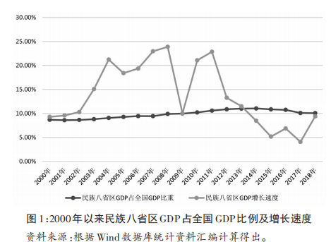 (一)民族地区经济获得高速发展和巨大增量,GDP 占全国比例稳步上升
