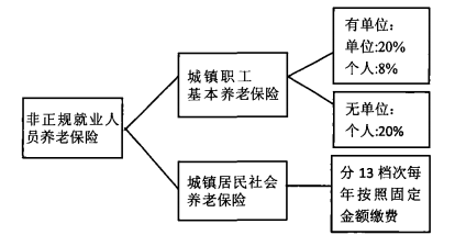 内蒙古的非正规就业人员目前可以参加的养老保险有两类,其一为城镇职工基本养老保险,只要在企事业单位工作的,就与单位的正式员工相同,原则上企业缴纳工资的20%,个人缴纳8%。政府鼓励有经济能力的非正规就业人员以个人身份参加城镇职工基本养老保险,缴费率为工资的20%,其中8%为个人账户,12%为社会统筹。其二是对于经济能力较弱的非正规就业人员,则可参加城乡居民社会养老保险。见图1。我们依次分析这两种养老保险制度。